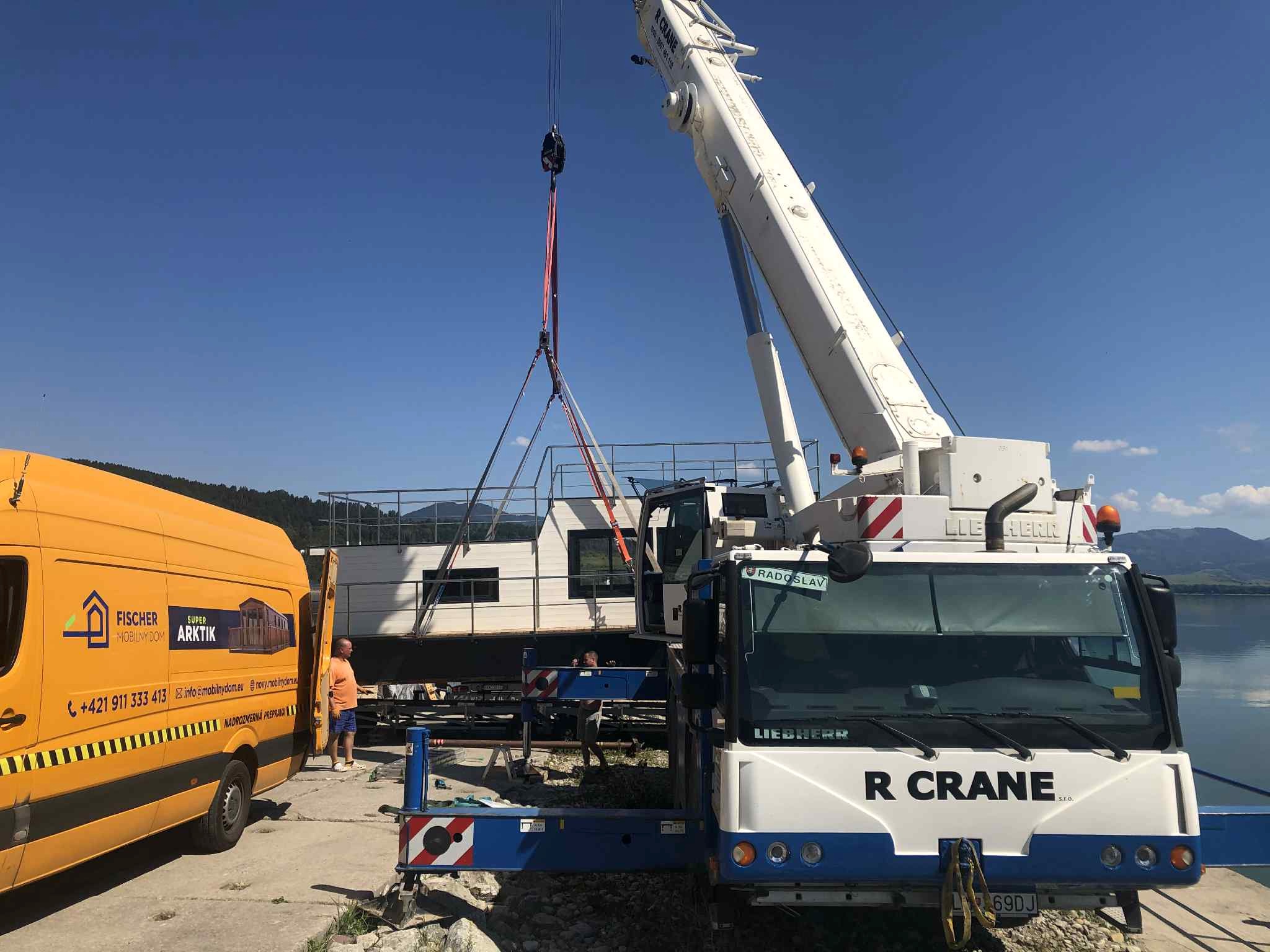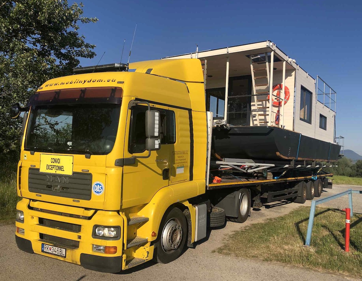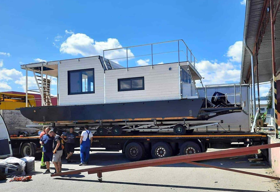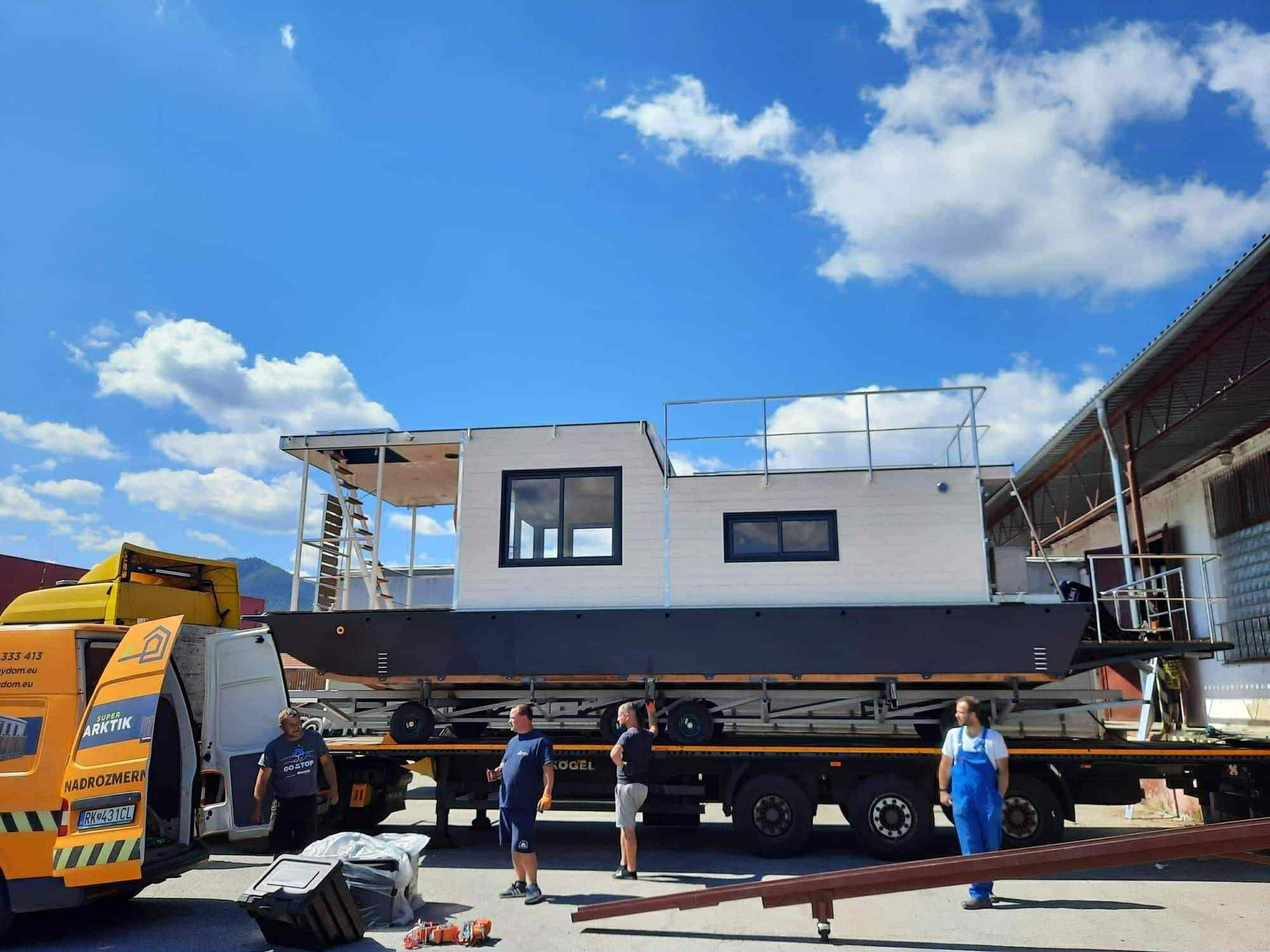 Plávajúci mobilný dom Super Arktik Houseboat pri prevoze.jpg