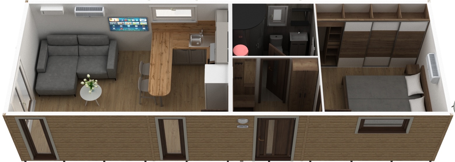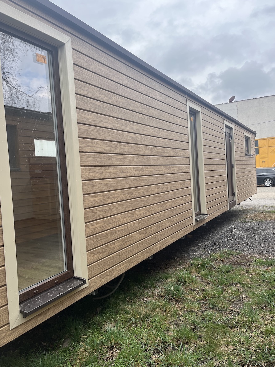 Mobilný dom Super Arktik 12×4 m s fasádou Honey Oak