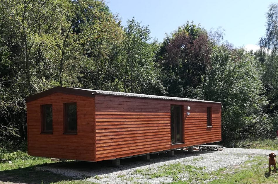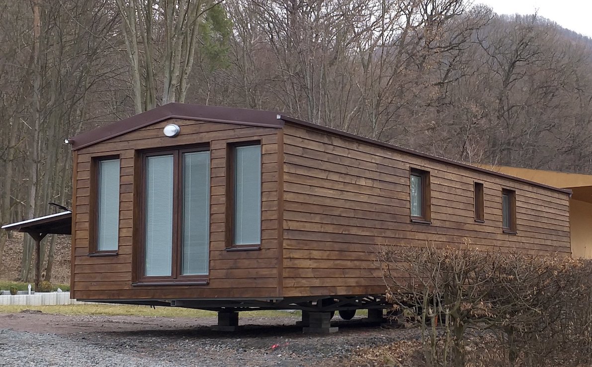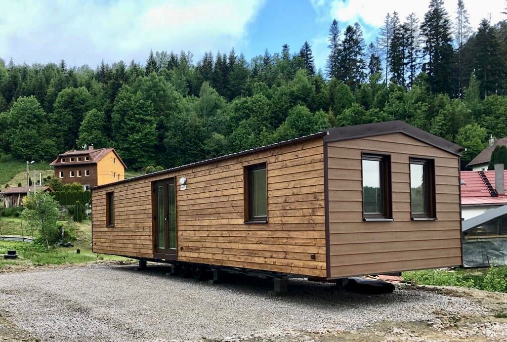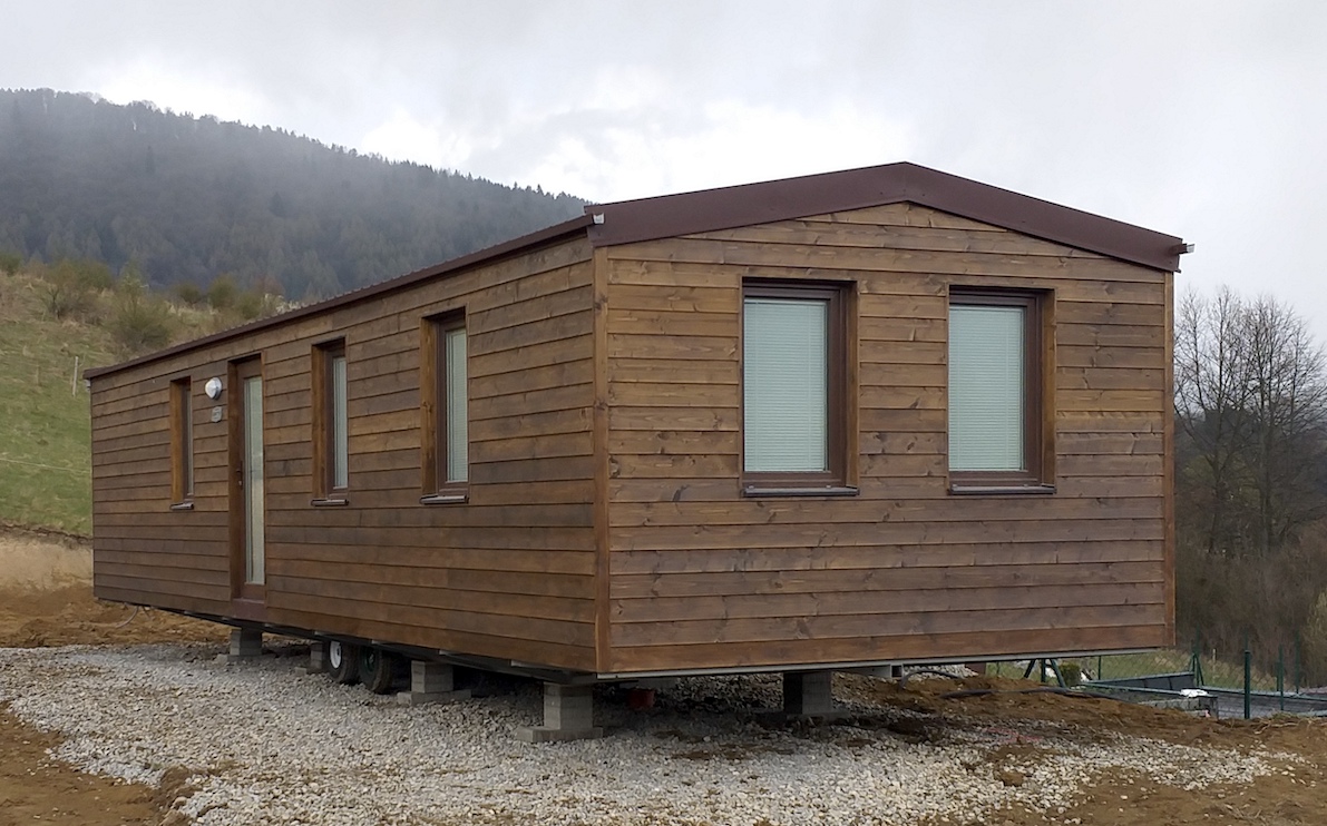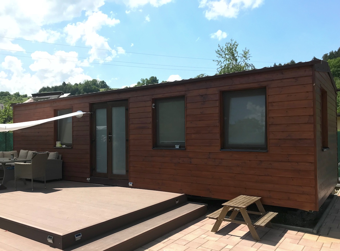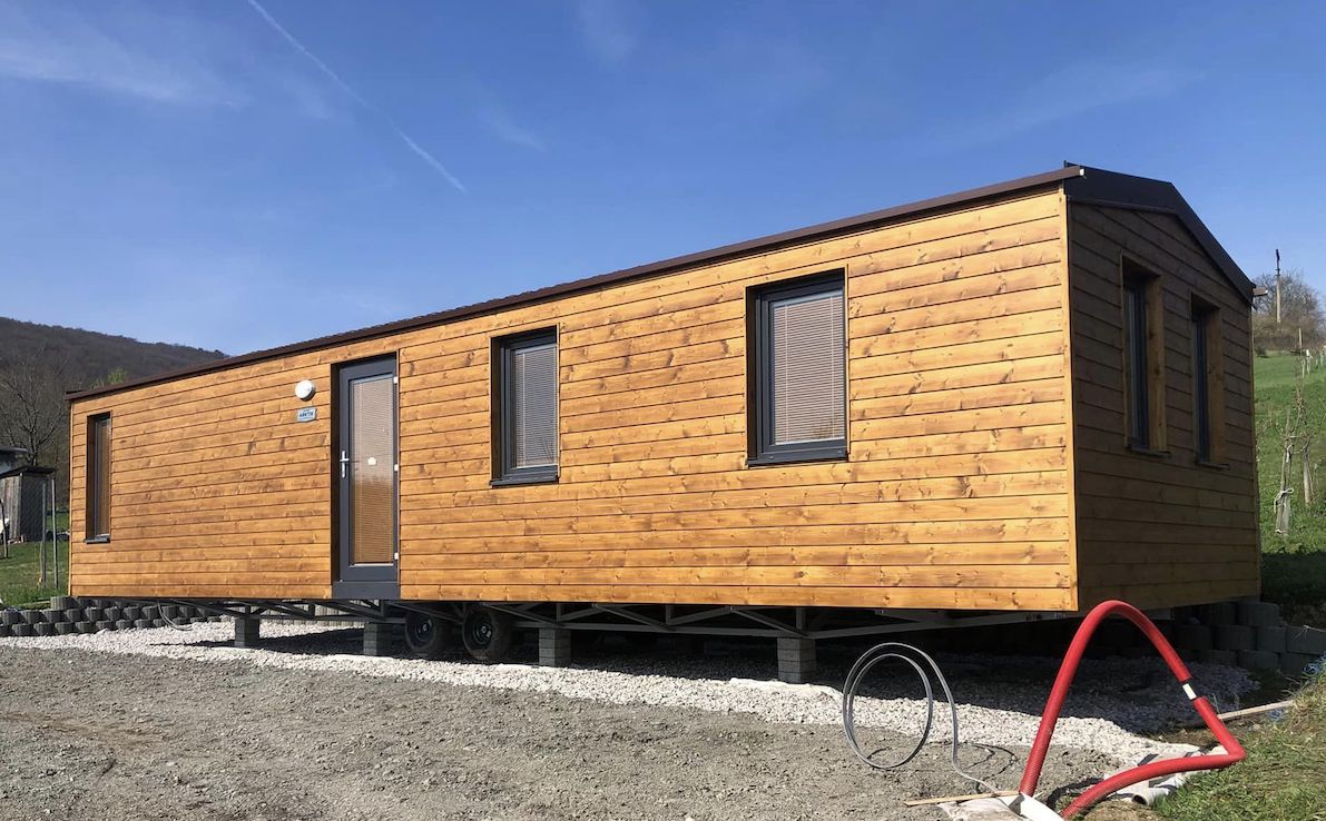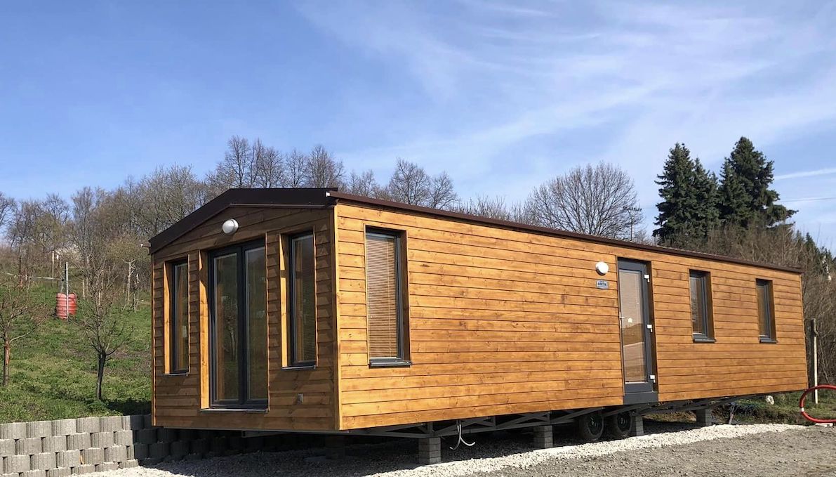 • Slovenský mobilný dom s dreveným obkladom a elegantným vzhľadom