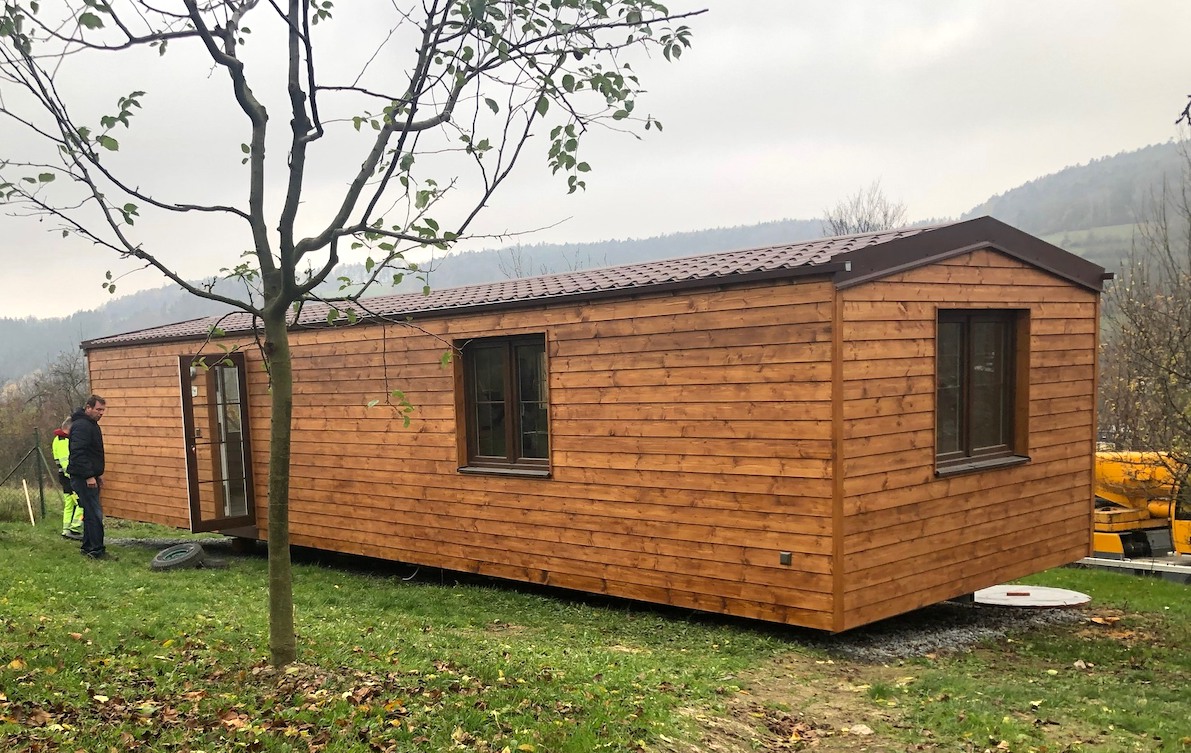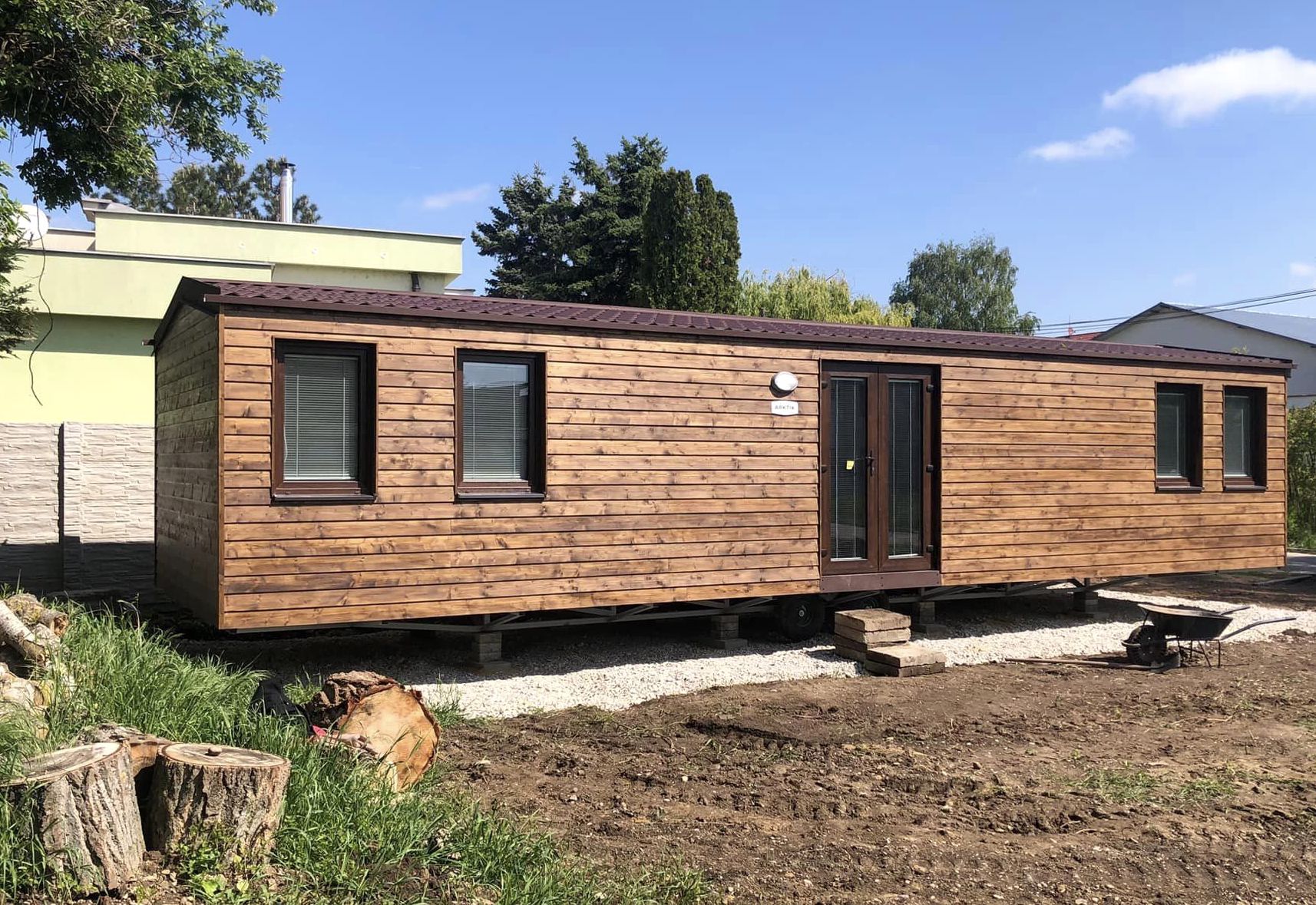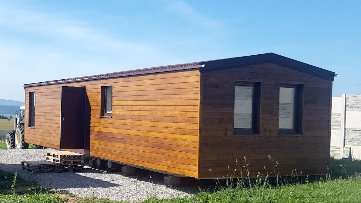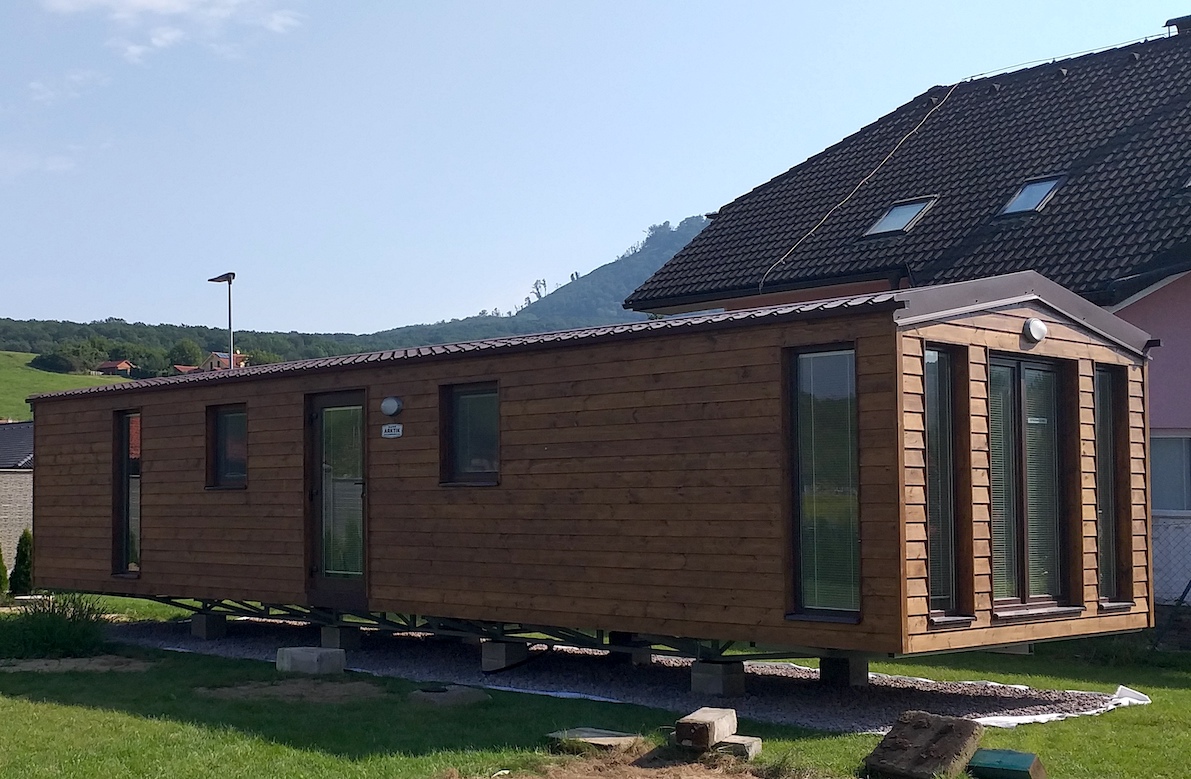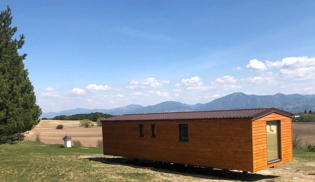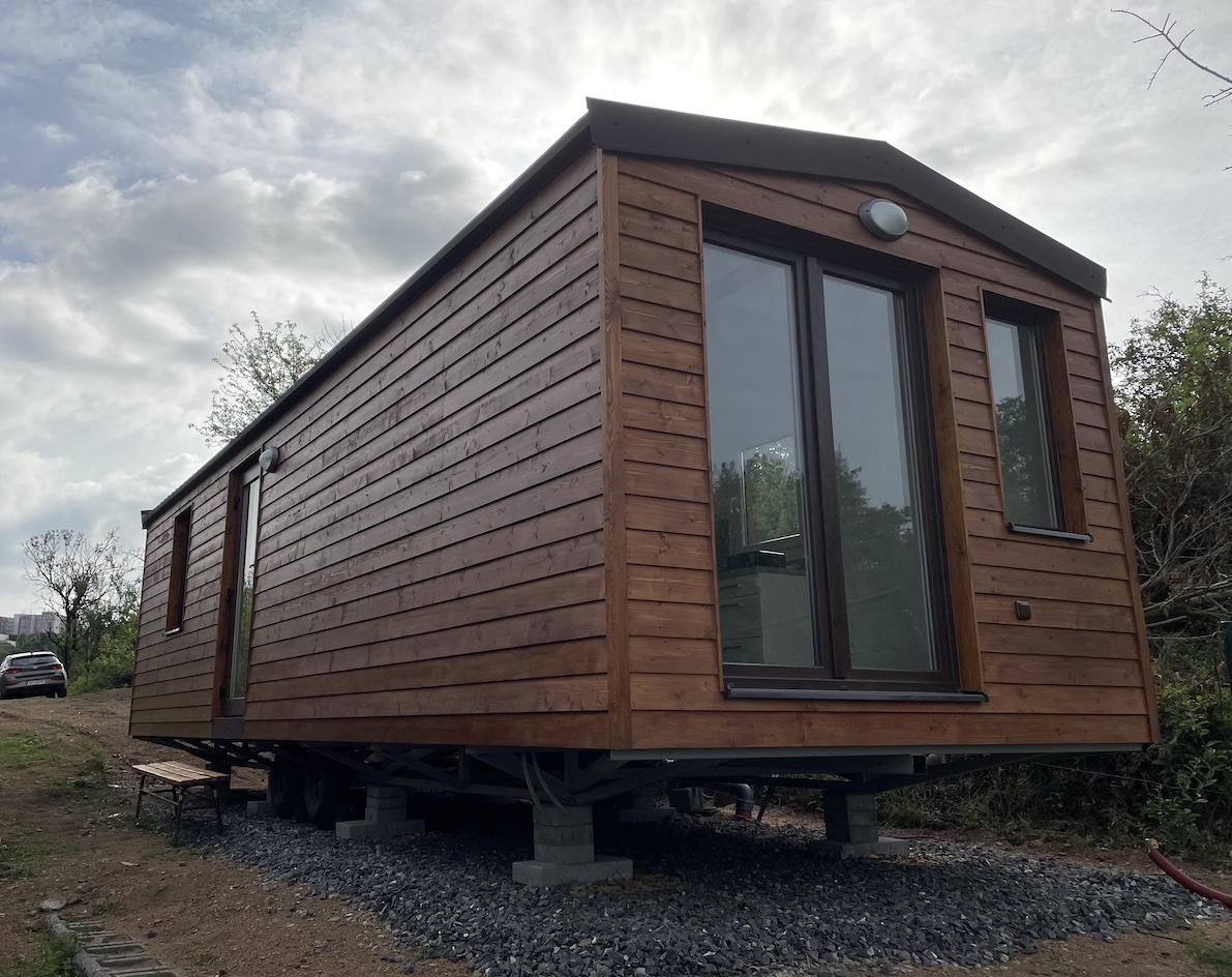 • Slovenský mobilný dom s dreveným obkladom a elegantným vzhľadom
