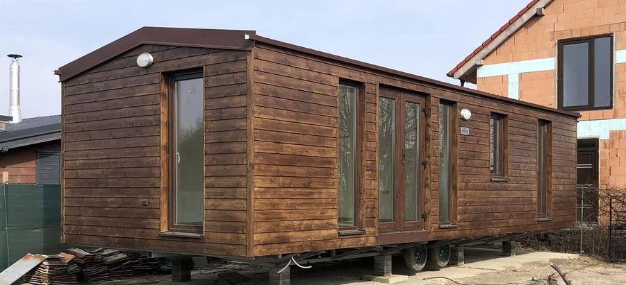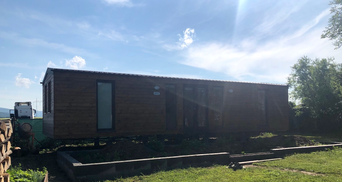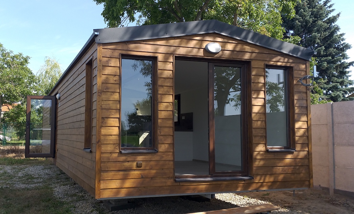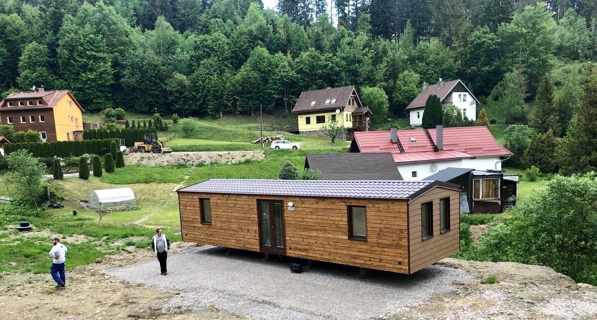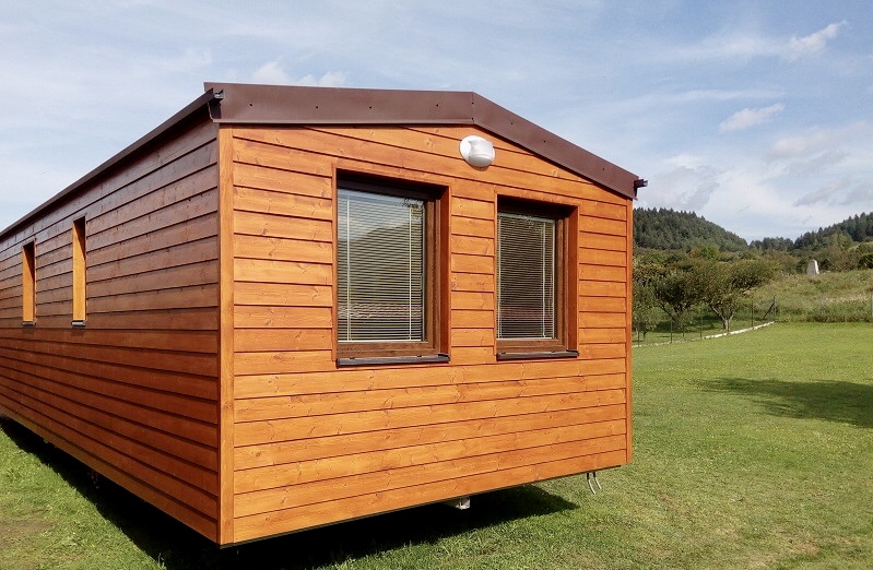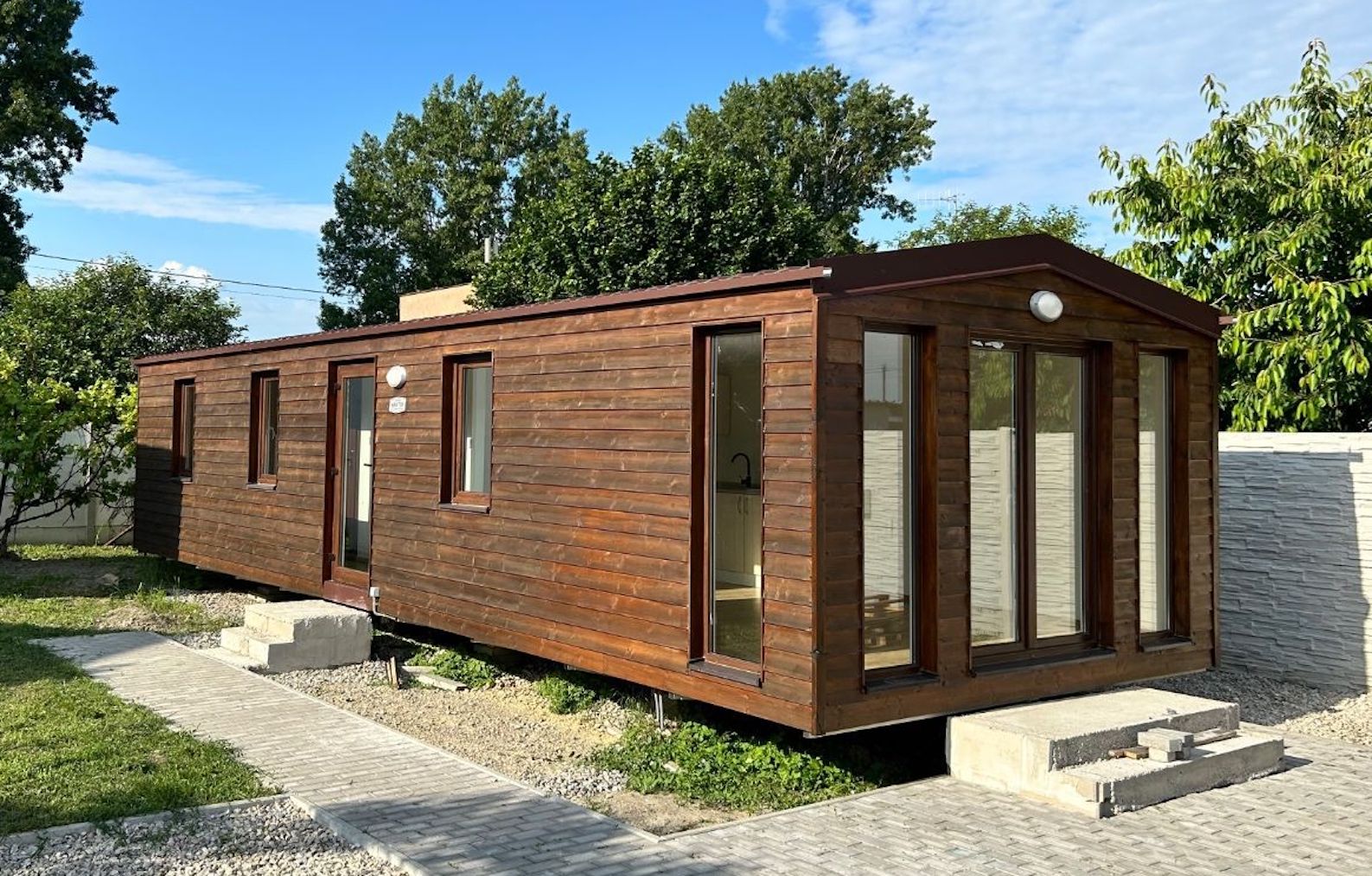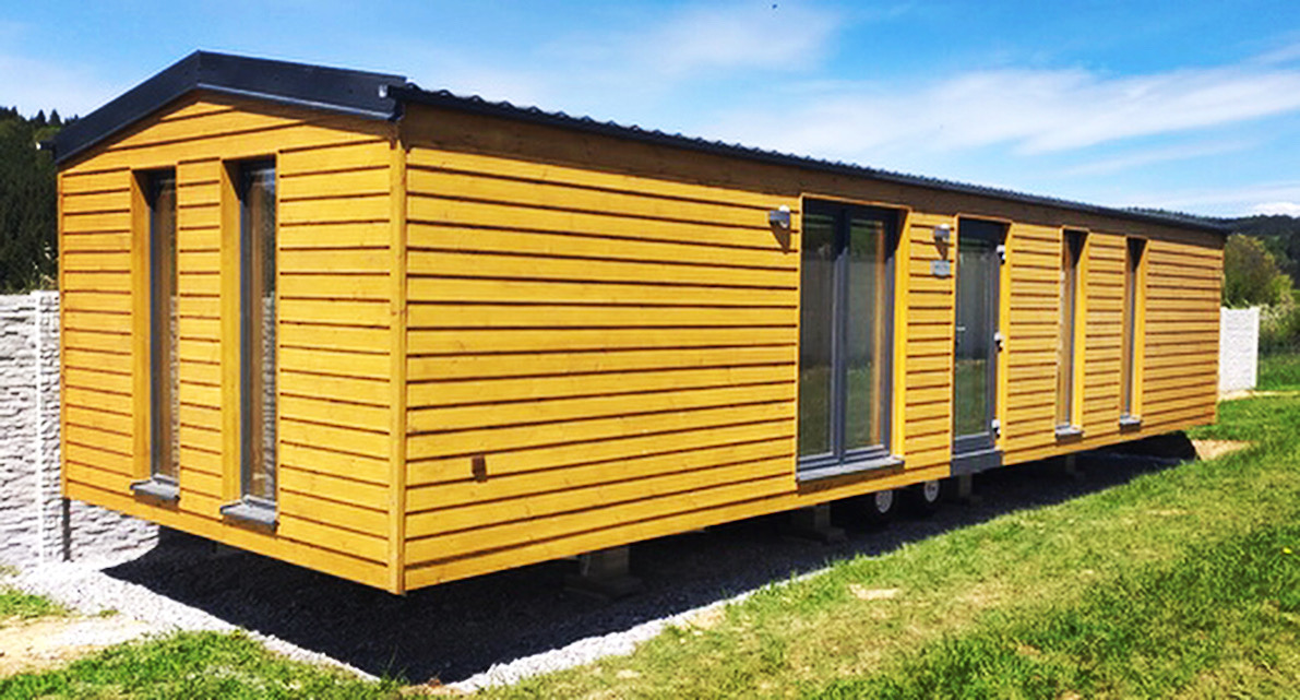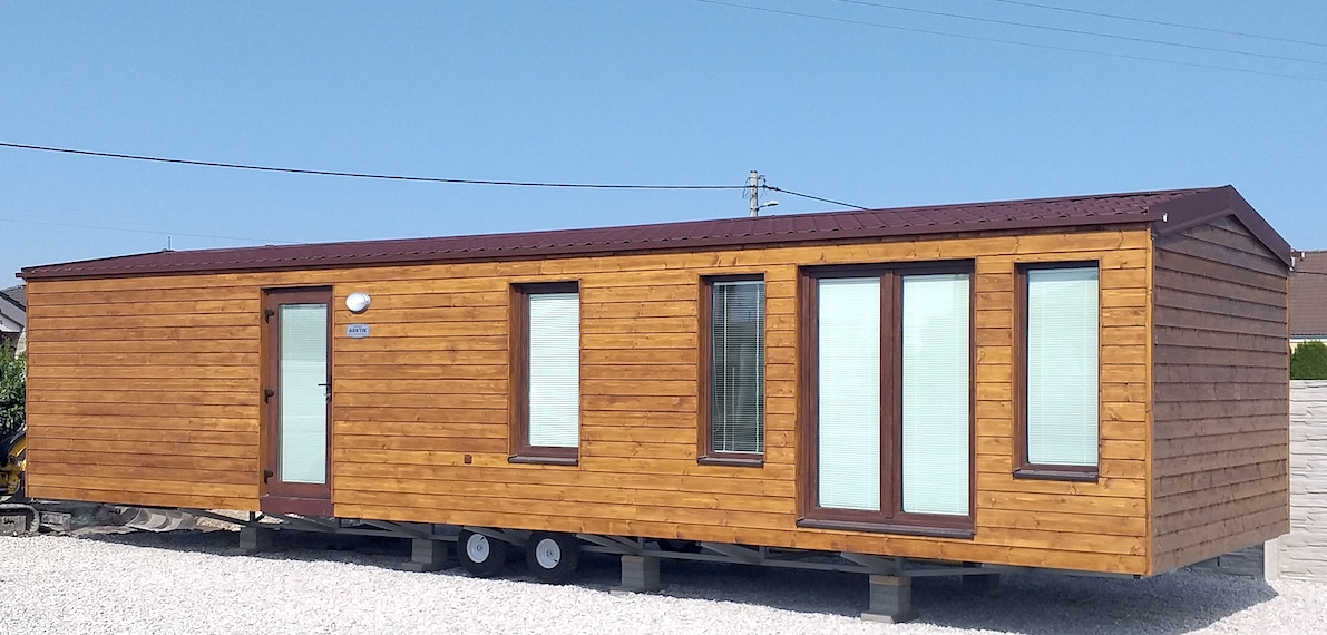 • Slovenský mobilný dom s dreveným obkladom a elegantným vzhľadom