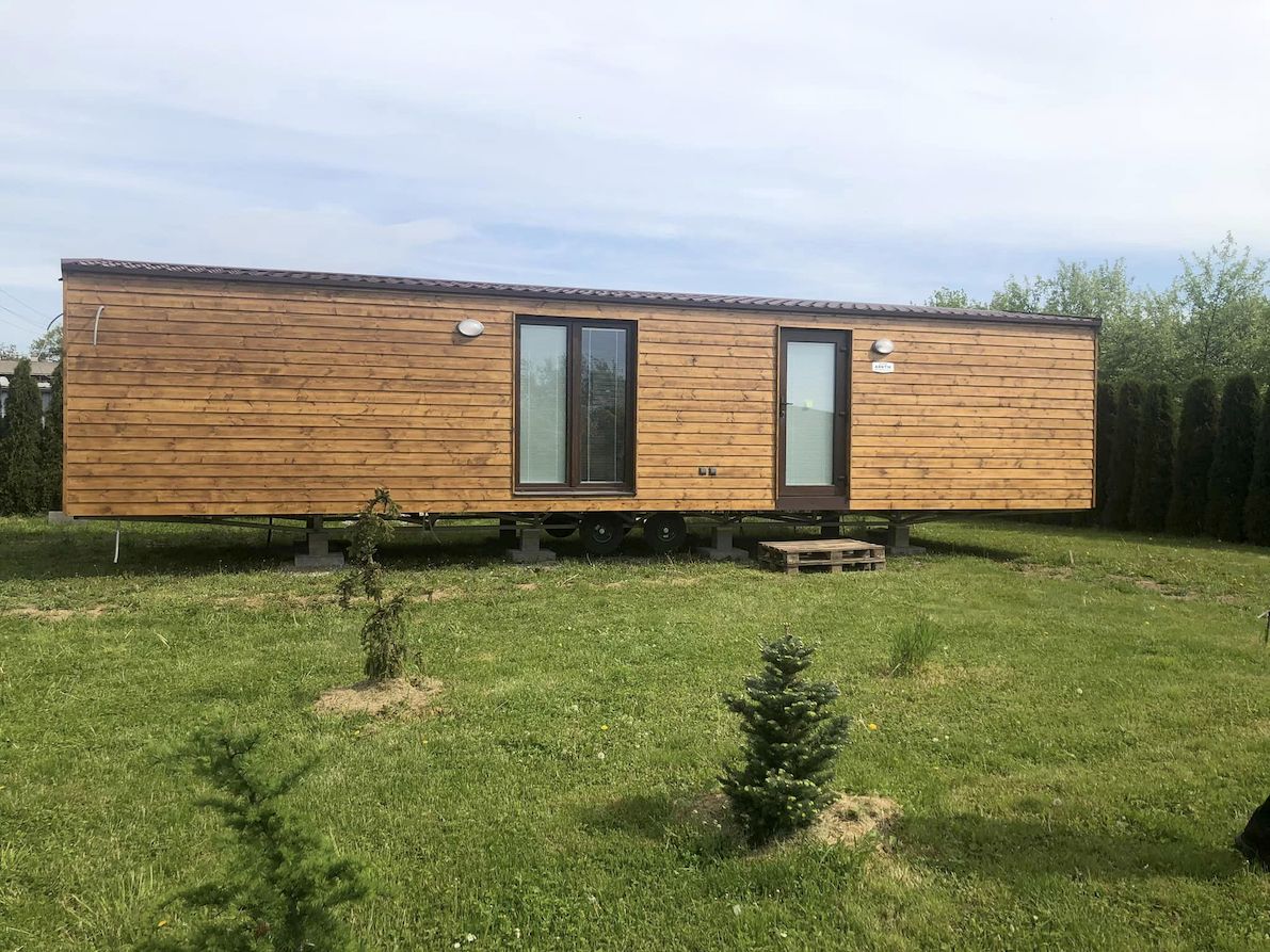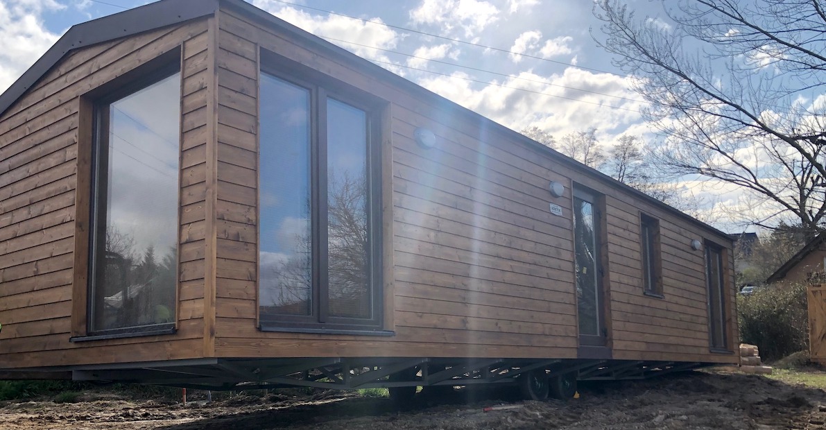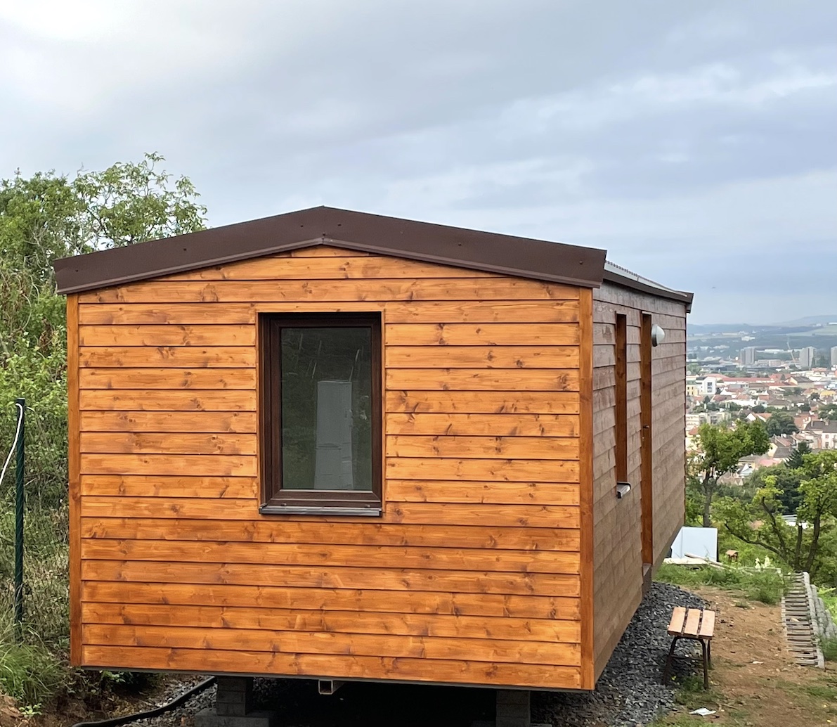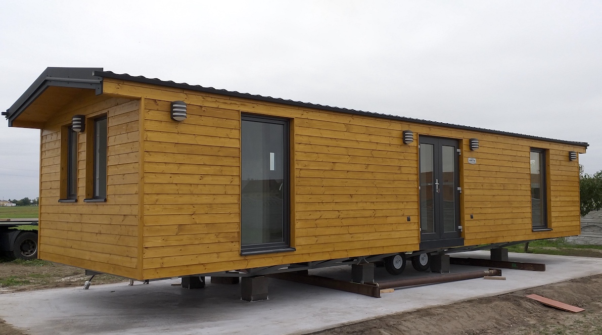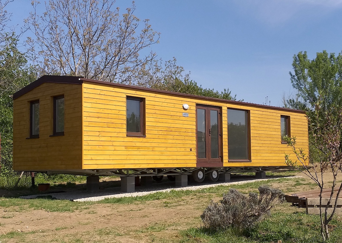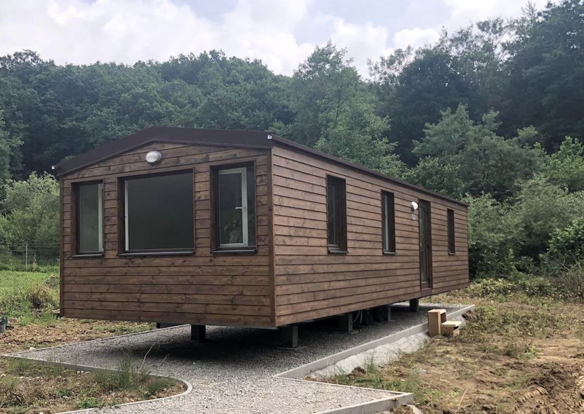 • Slovenský mobilný dom s dreveným obkladom a elegantným vzhľadom