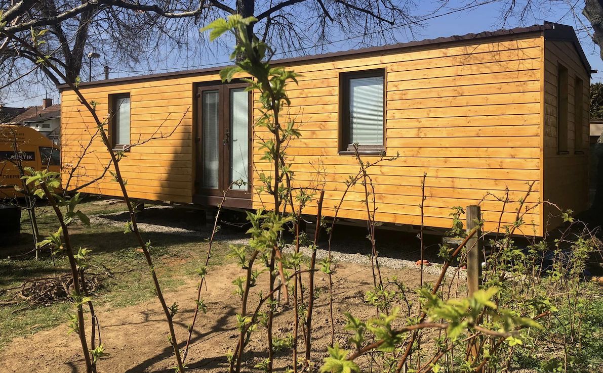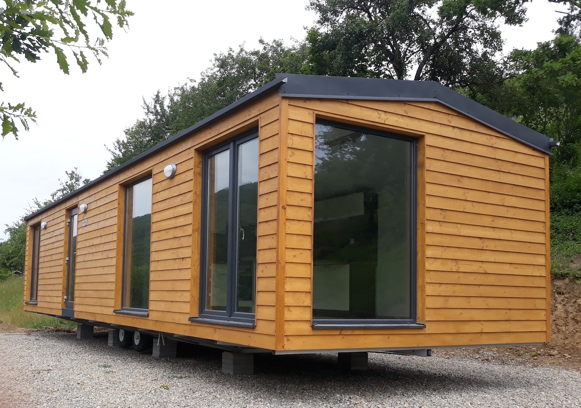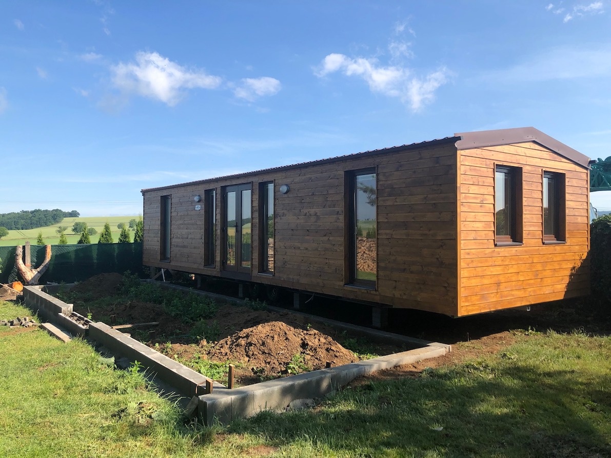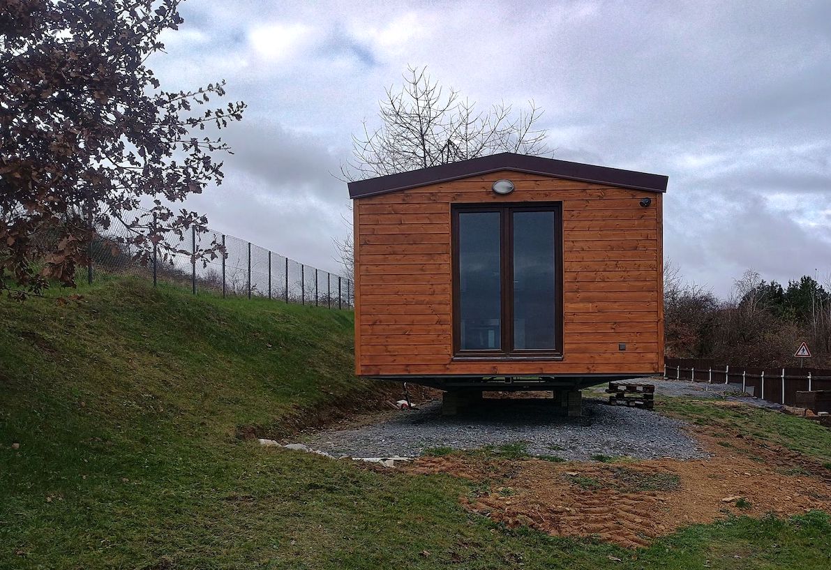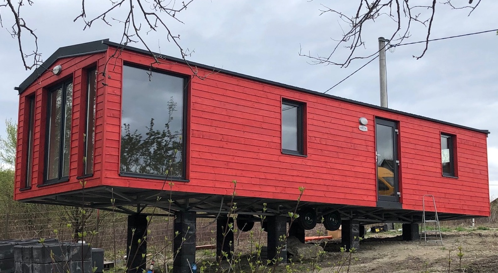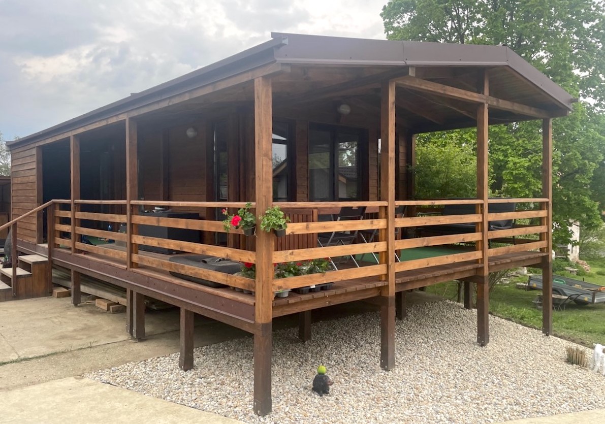 • Slovenský mobilný dom s dreveným obkladom a elegantným vzhľadom
