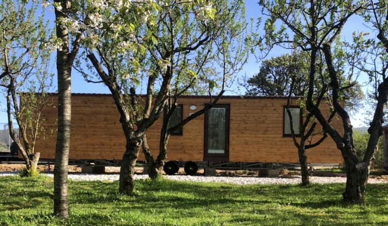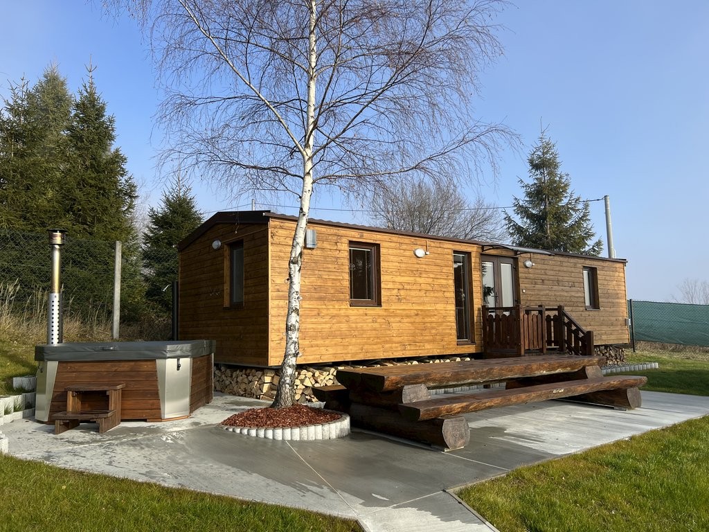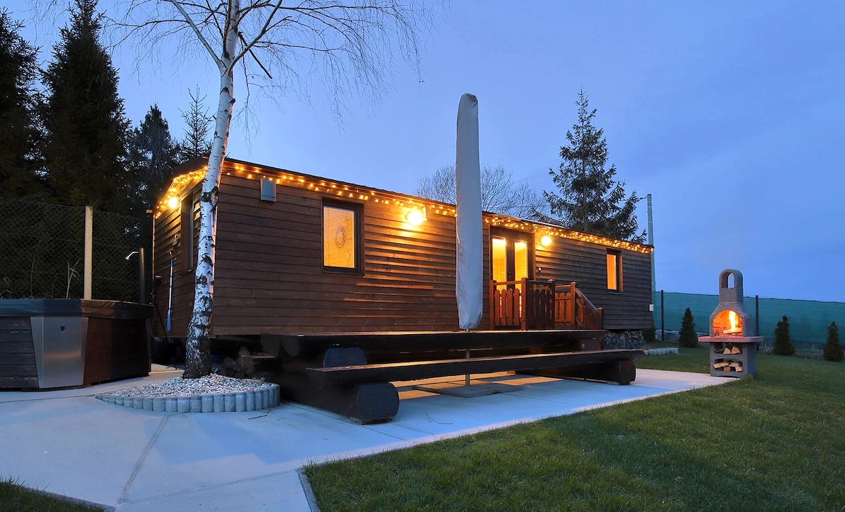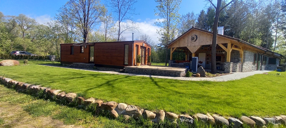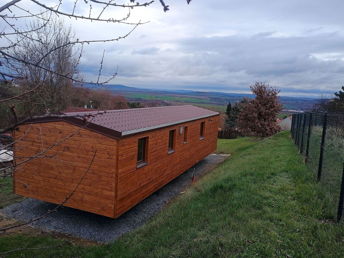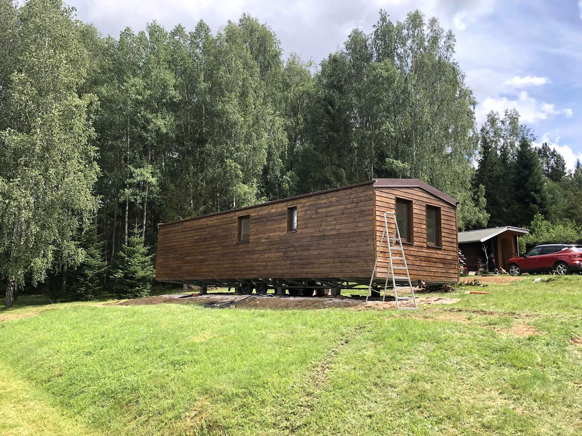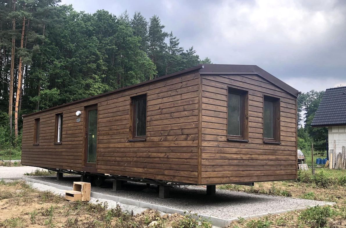 • Slovenský mobilný dom s dreveným obkladom a elegantným vzhľadom